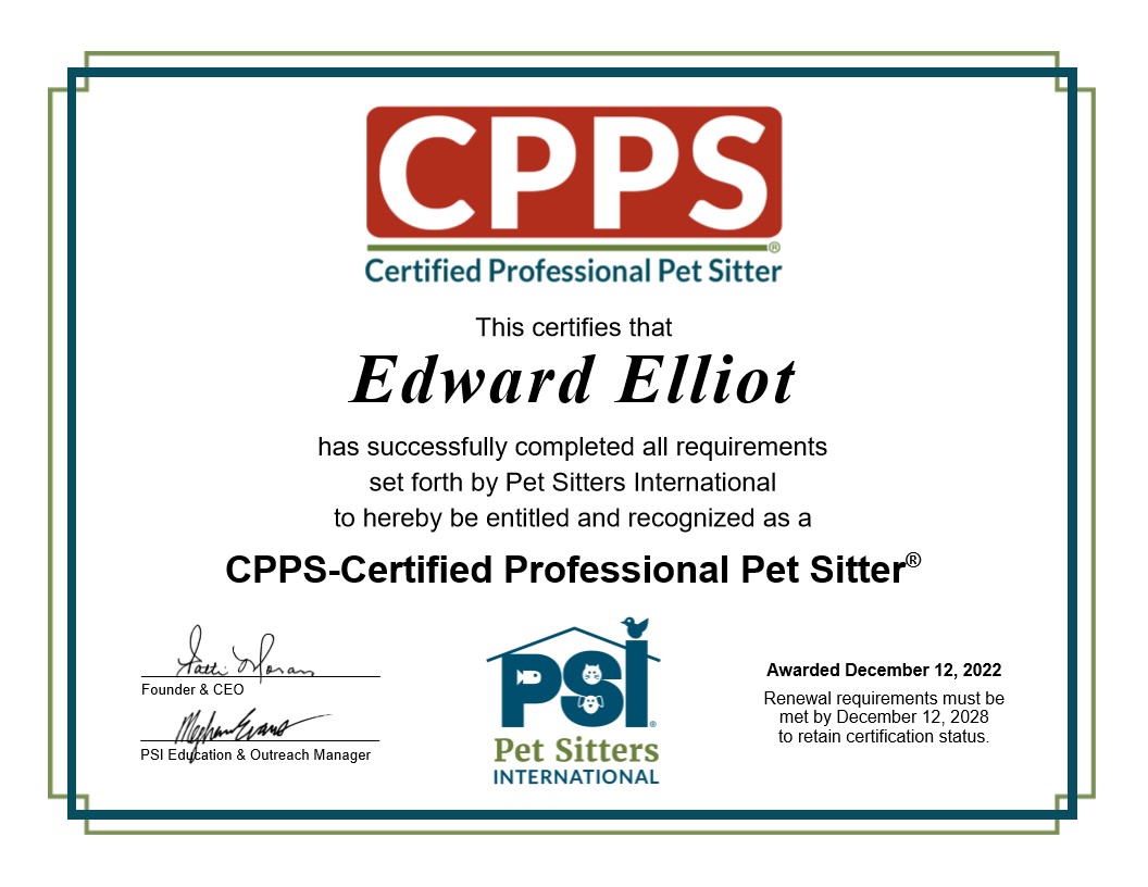 We are proud to be the only Certified Professional Pet Sitter (CPPS) recognized by Pet Sitters International (PSI) within a 50+ mile radius of Hershey, PA—a distinction that reflects our commitment to the highest standards in the pet care industry. In addition, our credentials include PSI Pet First Aid and CPR Certified, USDA Certification for Pet Transportation, and FEMA Certification for Animal Care During Disasters, among other advanced trainings. These qualifications allow us to confidently and safely care for pets in both routine and emergency situations.